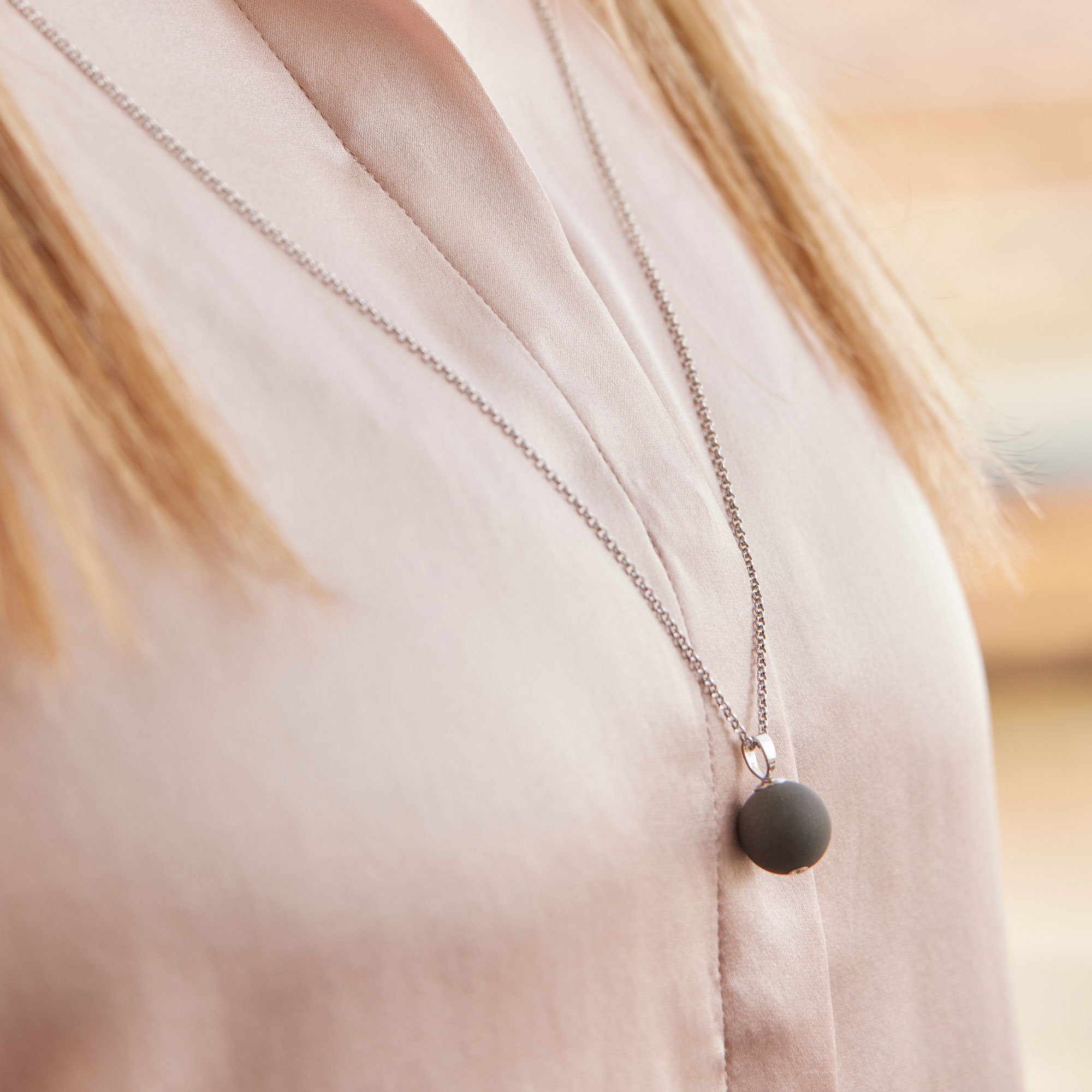 The outer surface of the ceramic pearl is finished with a special oil. Depending on the moisture content of the wearer's skin, the brightness of the pearl may be subject to natural fluctuations. Ceramic is a living material, i.e. the unglazed surface of the bead can therefore change in appearance. To prevent your Vulcano pearl from greying, you can moisten the pearl regularly with linseed oil, for example.